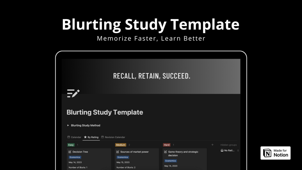 The Blurting Study Notion Template is designed to help you keep track of your progress and set reminders for your next revision. The template is user-friendly and customizable, allowing you to personalize it to fit your needs. With this template, you can improve your learning efficiency and achieve better results in your studies.