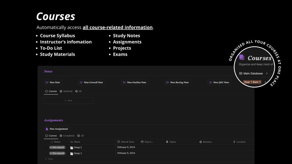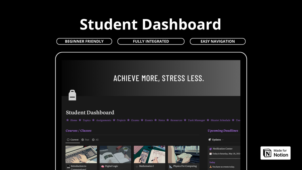 Unlock your full academic potential and take control of your student life with the Student Dashboard Notion Template. Simplify your studies, enhance your organization, and pave the way for success. Download now and embark on a journey towards academic excellence!